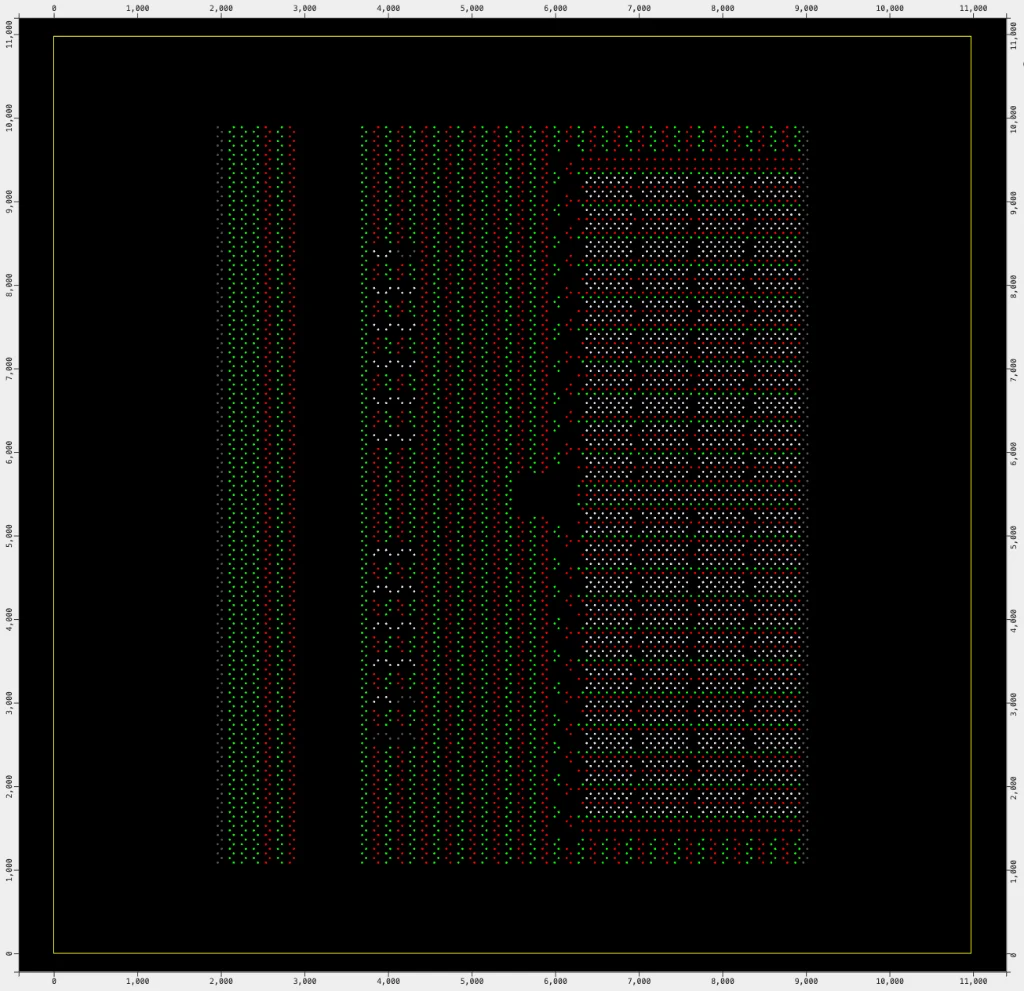 Bump map of HBM3. Signals are shown in white, Power and Ground are in red and green.