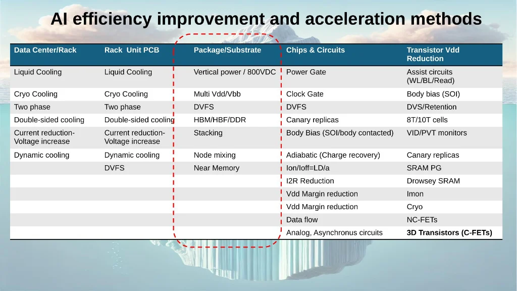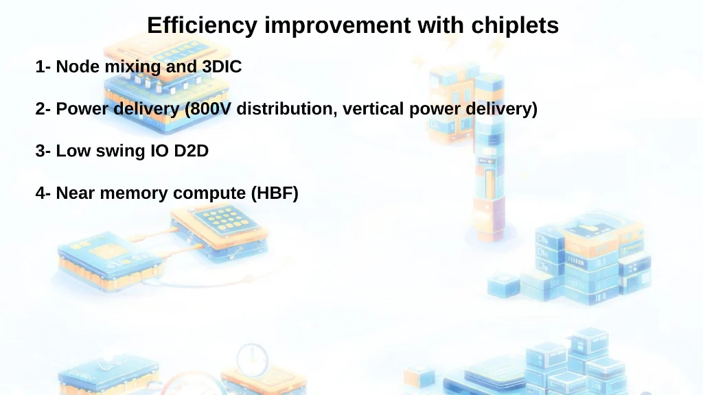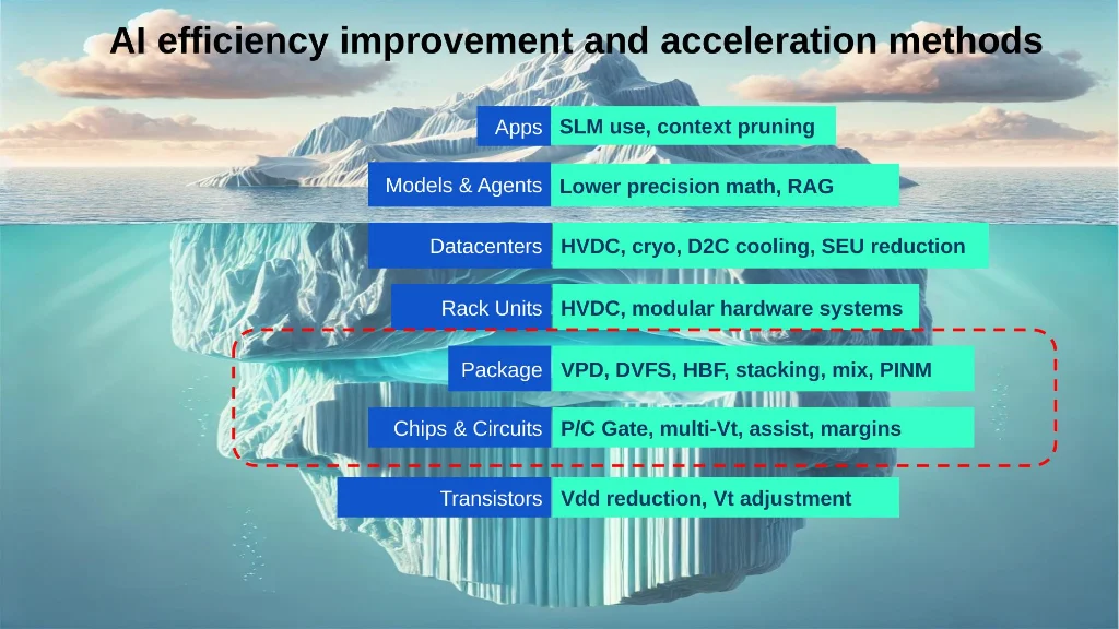 Key insight: The efficiency improvement toolkit is deep at every level of abstraction. The biggest wins, however, come from architectural decisions made at the package and chiplet level — where the greatest design freedom still exists.