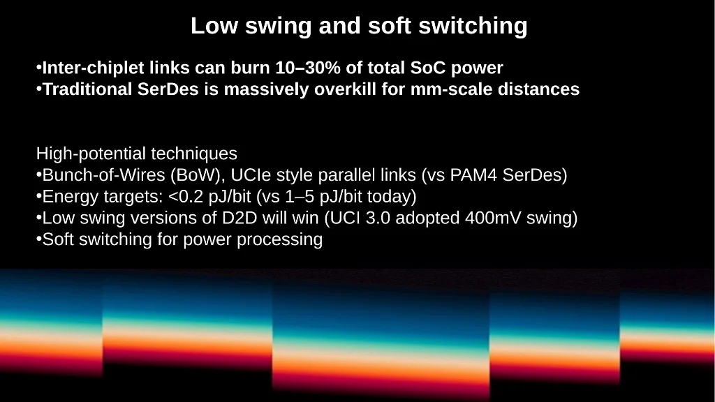 The physics are compelling: switching energy scales as ½ × C × Vdd². Cutting the voltage swing from 800mV to 400mV reduces switching loss by 75%. This is the driving force behind protocols like UCIe and HBM's steady migration to lower swing voltages.