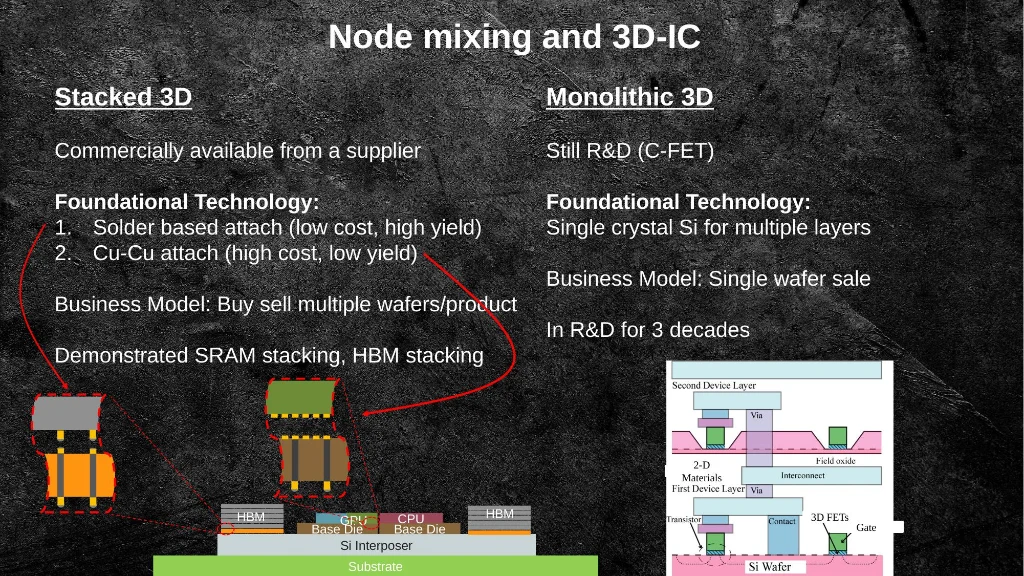 Nasrullah distinguishes between stacked 3D — commercially available today, using solder or Cu-Cu attach — and monolithic 3D, which remains in R&D and requires single-crystal silicon for multiple active layers. Stacked 3D delivers yield improvements and better voltage-to-device matching today; monolithic 3D is a longer-horizon bet.