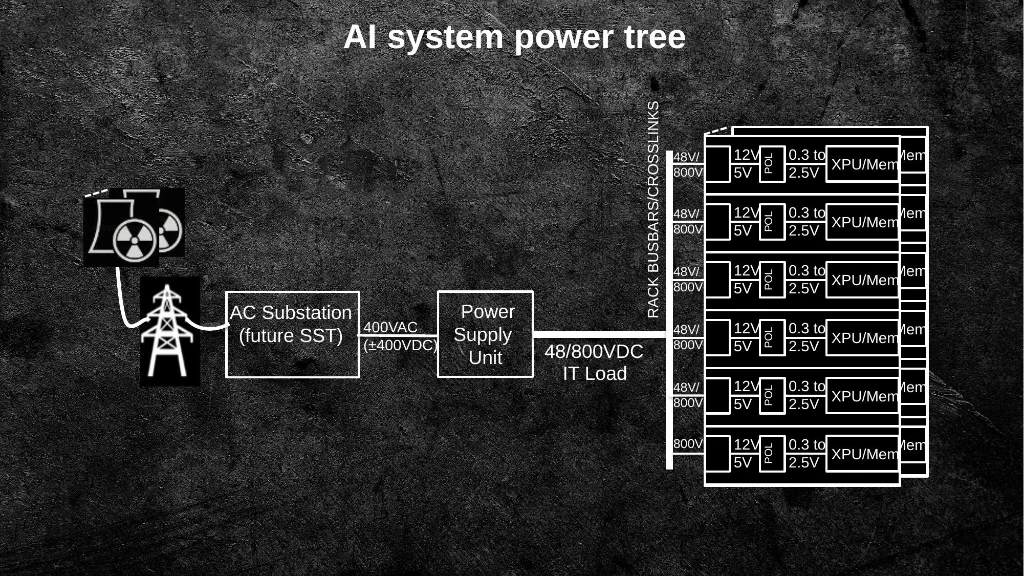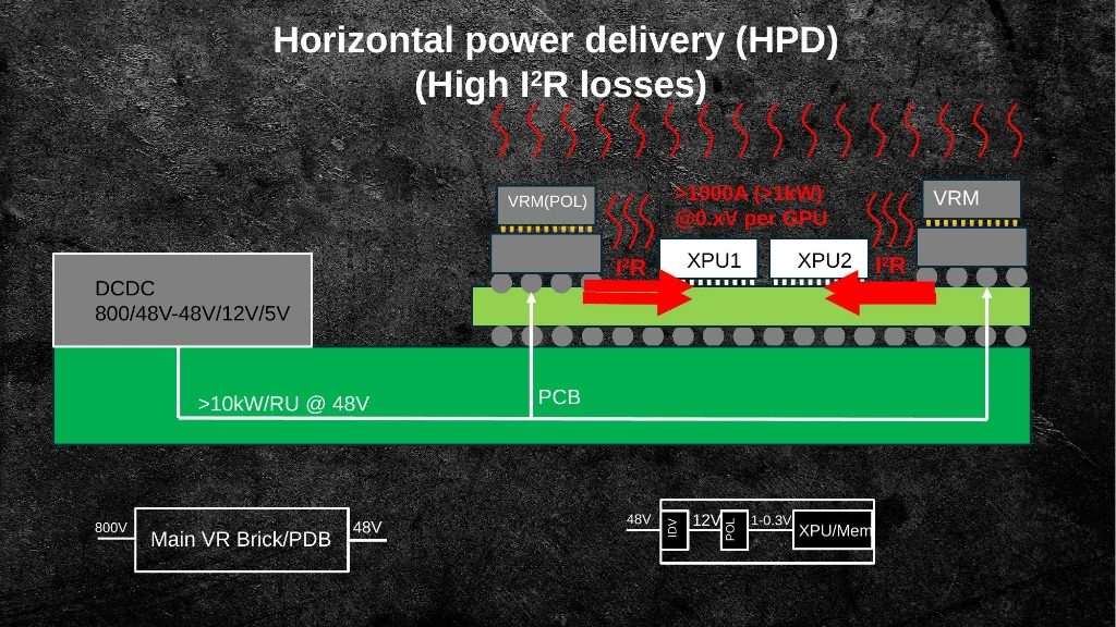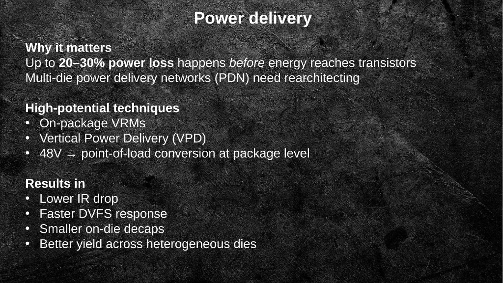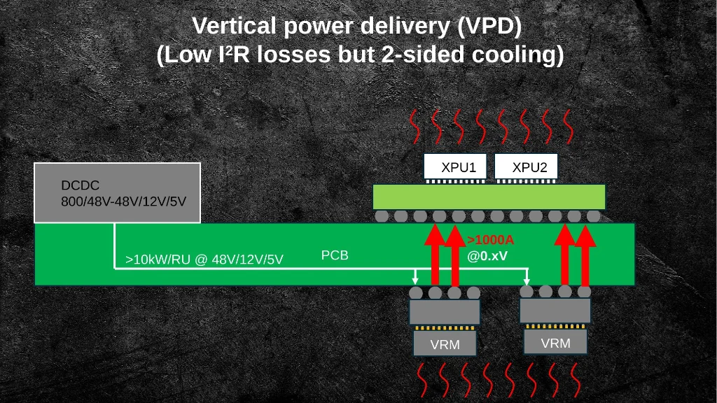 Vertical Power Delivery (VPD) moves the voltage regulator module directly beneath the compute die, cutting the high-current path from centimeters to micrometers. The tradeoff is two-sided cooling, but the power efficiency gains — lower IR drop, faster DVFS response, smaller on-die decaps — are substantial for dense AI systems.
