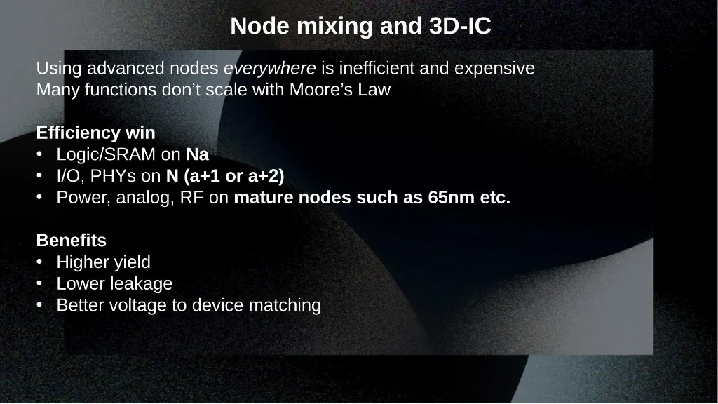 The premise of node mixing is deceptively simple: not every function benefits from the latest process node. Advanced nodes are expensive, power-hungry for certain workloads, and wasteful when applied to I/O, analog, or RF functions that don't scale with Moore's Law.