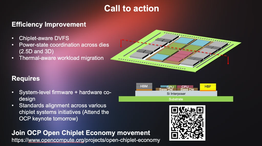 Nasrullah closes with a systems-thinking call to action. The four techniques above are not independent optimizations — they interact. Chiplet-aware Dynamic Voltage and Frequency Scaling (DVFS) requires power-state coordination across dies in both 2.5D and 3D configurations. Thermal-aware workload migration requires the firmware stack to see across die boundaries. None of this happens without standards alignment.