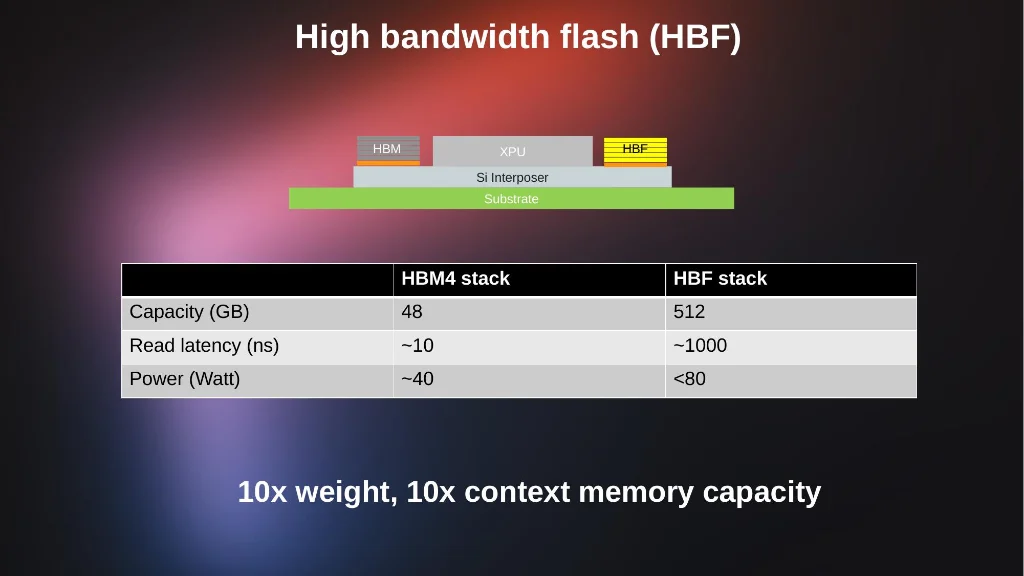 High Bandwidth Flash (HBF) offers 10× the capacity of HBM4 per stack, enabling AI systems to hold dramatically larger context windows on-package. The latency penalty (~1µs vs ~10ns) is acceptable for prefetch-heavy workloads where the alternative is a round-trip to external DRAM or SSDs.